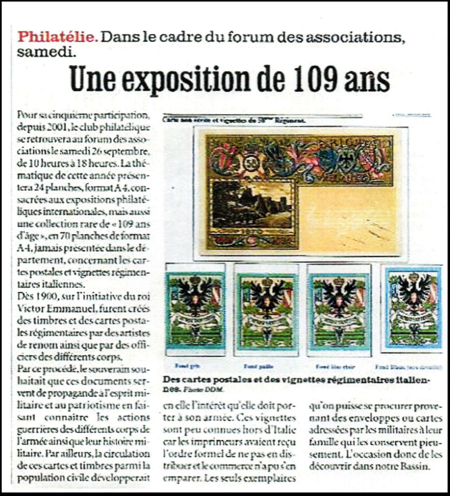 Le samedi 26 septembre 2009, pour la 5ème participation au forum des associations de DECAZEVILLE (Aveyron) le club philatélique a été sollicité pour apporter son concours à cette manifestation, en présentant une exposition purement philatélique de 24 planches format A4 sur les expositions internationales depuis 1949, mais également une présentation érinnophile, de 70 planches de même format, consacrée uniquement aux vignettes et cartes postales régimentaires Italiennes.