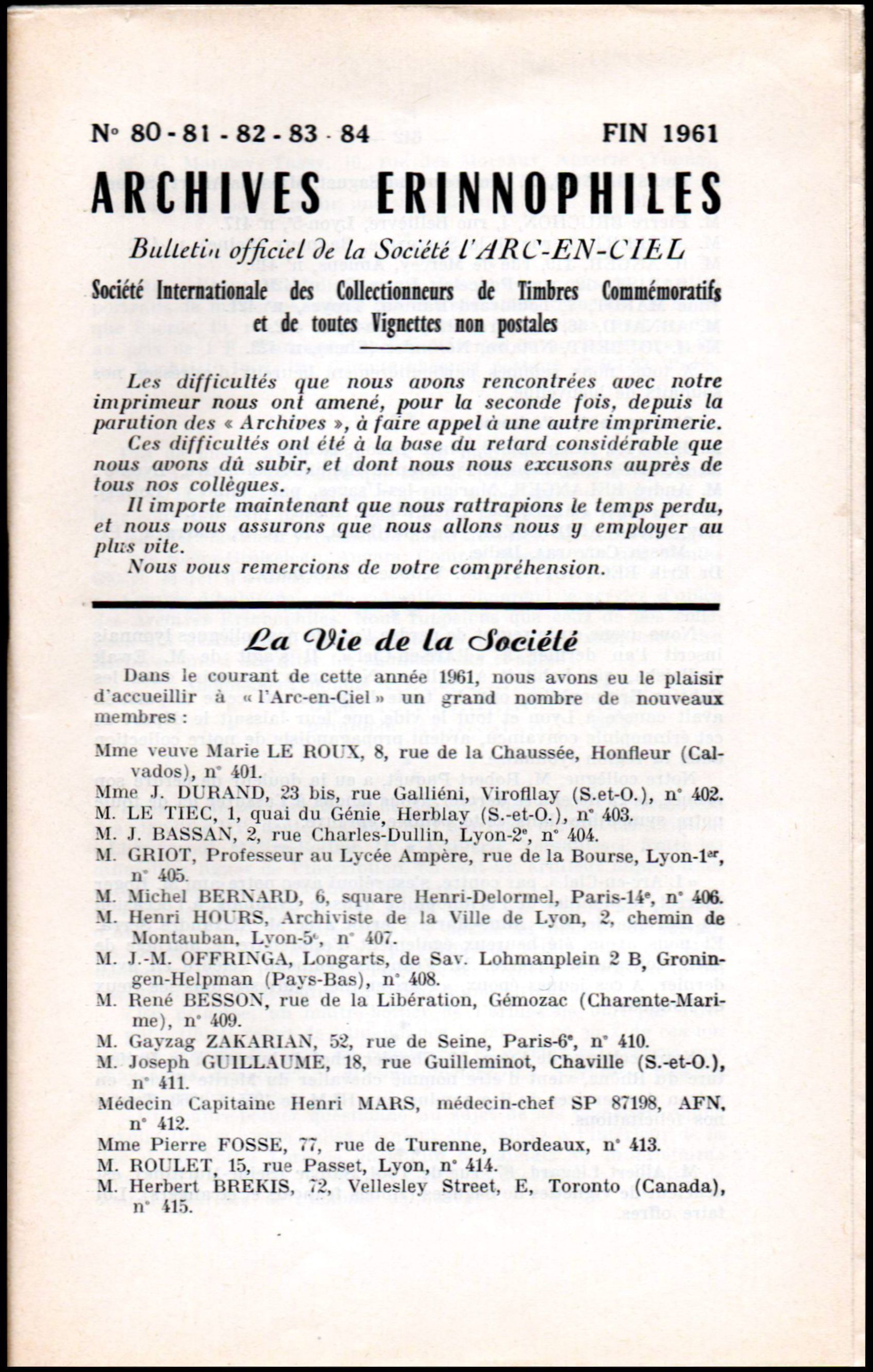 Mais, c’est en 1943, en pleine seconde guerre mondiale, qu’une tentative de bulletin propre à L’ARC-EN-CIEL prend naissance. Nous vous présentons ci-dessus le numéro 1 intitulé « LES ARCHIVES ERINNOPHILES » daté de Juin 1943. Deux autres bulletins identiques suivront en Septembre (auquel sera joint la liste des Nouveautés pour 1939 et 1940) et Décembre 1943 (avec la liste des Nouveautés de 1938 concernant les vignettes Commémoratives, d’Aviation, Antituberculeuses + compléments aux listes annexées au Bulletin de Septembre 1943 + suite des fascicules du Catalogue des « Vignettes de France » de Gustave BERTRAND).