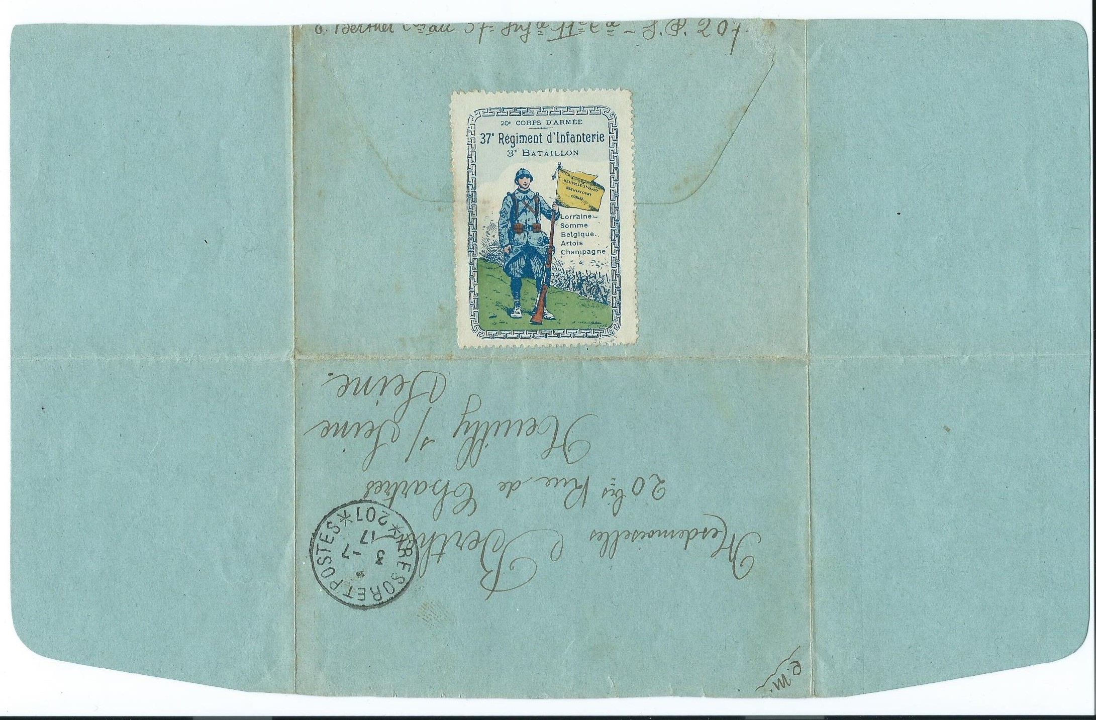 Le 2 juillet 1917, le caporal Bertet (Doudou?) écrit à sa tante et colle sur sa lettre la vignette