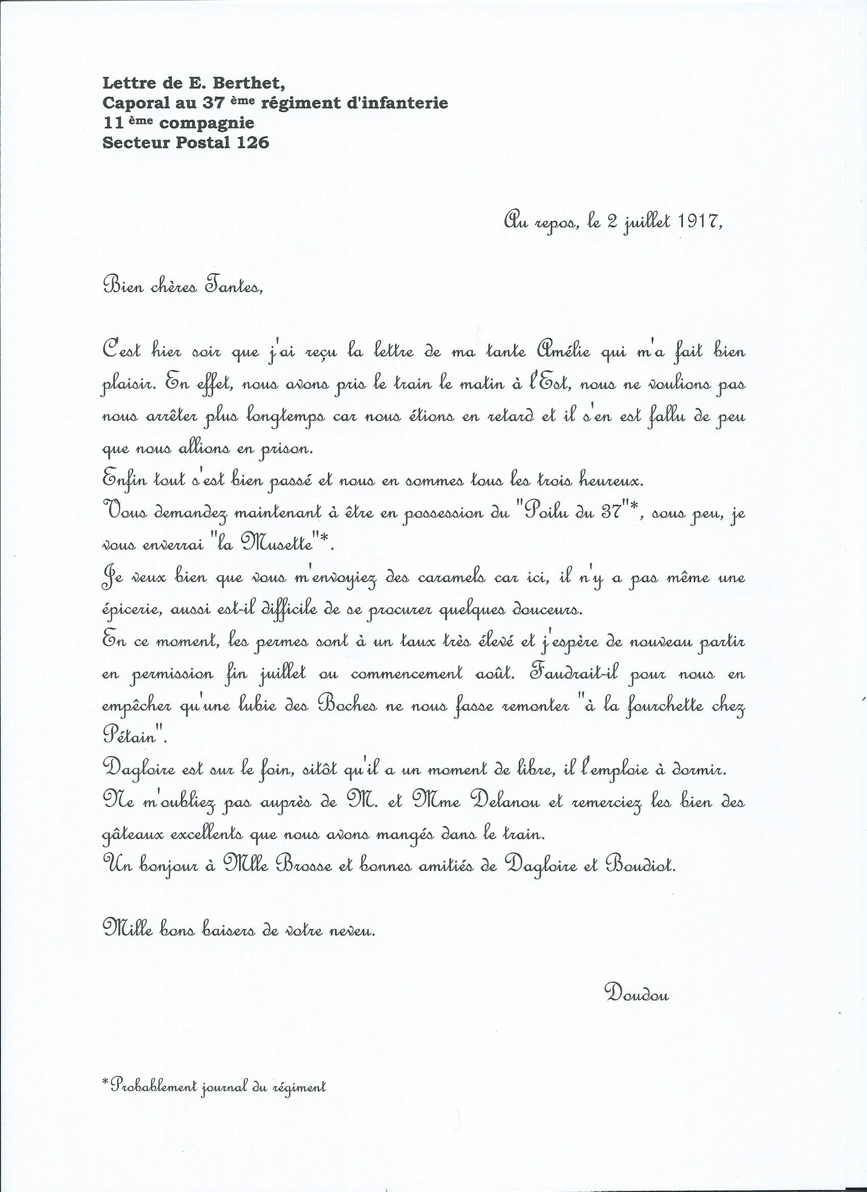 Le Caporal Bertet raconte son retour de permission, il demande des friandisesà ses tantes et évoque son possible retour en première ligne « à la fourchette chez Pétain »