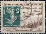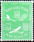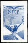 21 – RV. Une femme appuyée sur les armes de la ville tend une couronne à l’aéroplane qui survole Cannes. Imprimée en feuilles de 50 (10 x 5). 27 x 37. Dentelée 11 et ND.