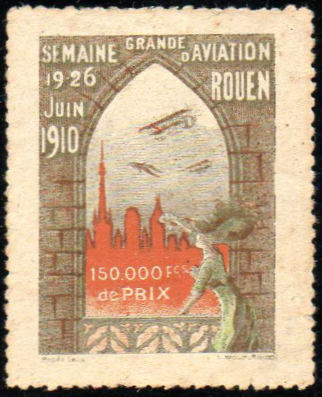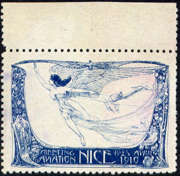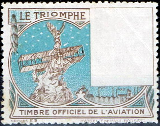 8 – RH. Vignette porte-timbre. Reproduction de la maquette de Paul Roussel. « Le Triomphe. Timbre officiel de l’aviation. Déposé E. B. Maquette de Paul Roussel ». 43 x 32,5. Dentelée 11.
