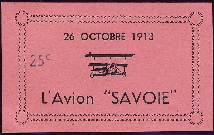 98 A – RH. Avion « Savoie » au centre. A gauche, valeur indiquée « 25 c » apposée par surcharge à la main. Inscriptions. 80 x 48. ND.