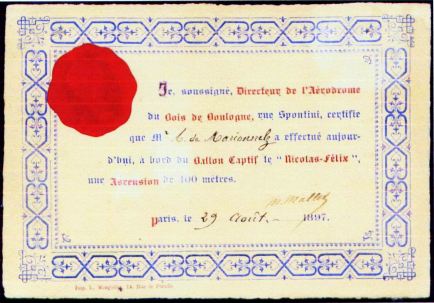 PARIS. Ascension dans le ballon captif de la Porte Dauphine, le « Nicolas Félix ». Vignette apposée sur un certificat d’ascension daté du 29 août 1897, signé M. MALLET.