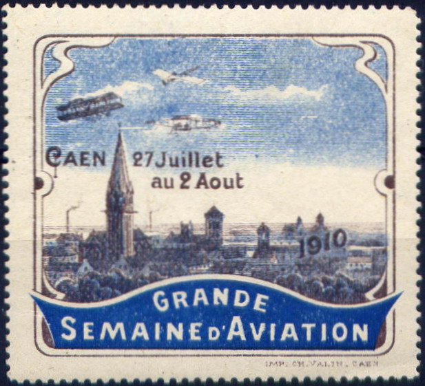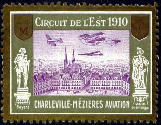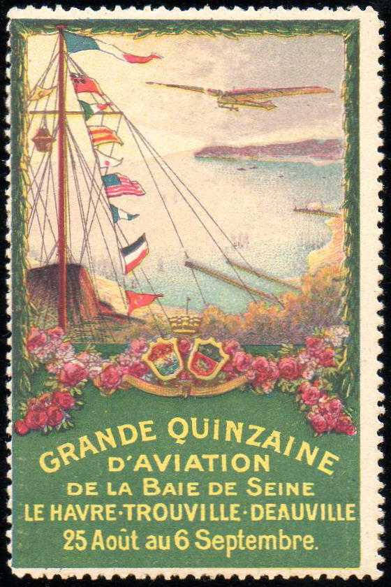 16 – RH. Sept appareils en vol, au-dessous du château, de l’aérodrome et des tribunes. En médaillon, Blériot (à gauche) et Lefebvre (à droite), la première victime de l’aéroplane. 46 x 26. Dentelée 10 et ND.