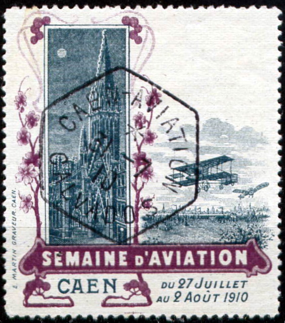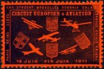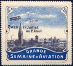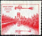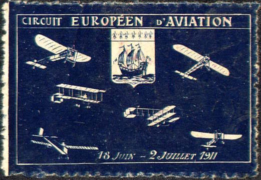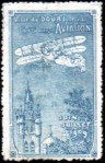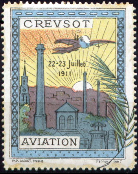92 bis – Vignette ronde, diamètre 59 mm. Vue de l’église que survolent 4 oiseaux et un biplan minuscules. Monoplan Blériot en vol vers la droite. Inscriptions : « Ville de Saulieu / Fête d’Aviation / 11 et 12 Août / 1912 ».