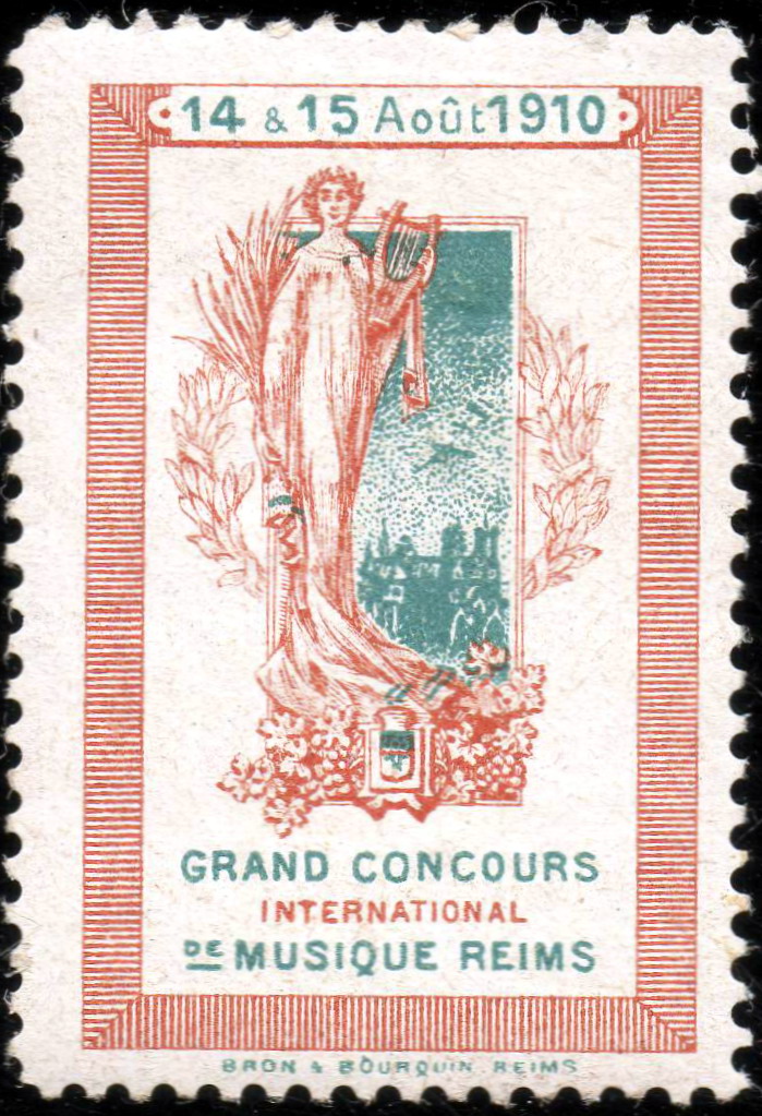 Un deuxième type, avec couleur sur le mot « Exposition » et sans couleur sur les ornements situés de chaque côté du cartouche (correspondant à la vignette de Romilly-sur-Seine sur laquelle la joueuse de harpe est à droite).
