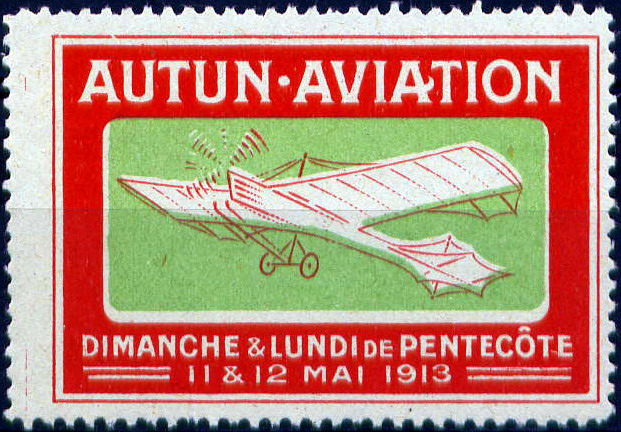 96 – RH. Monoplan en vol. Inscriptions : « Autun – Aviation / Dimanche et lundi de Pentecôte / 11 et 12 Mai 1913. Imprimée en feuilles de 60 (6 x 10). 46,5 x 31. Dentelée 11,5 et ND.