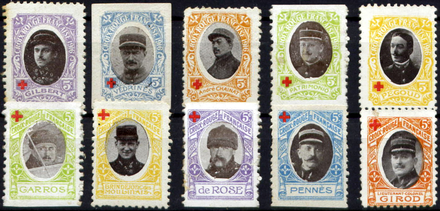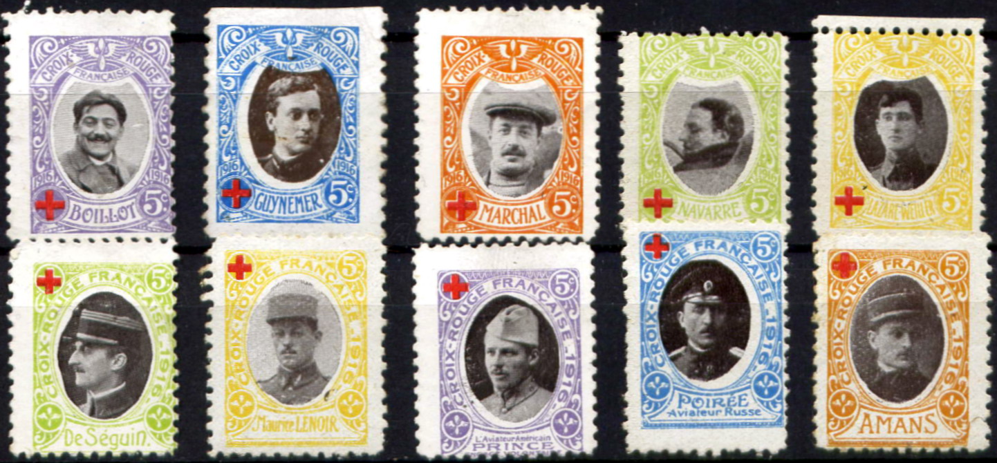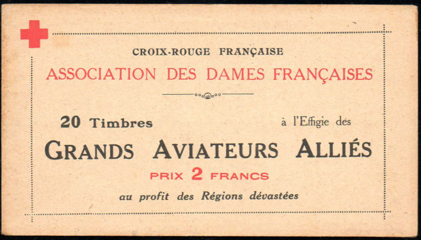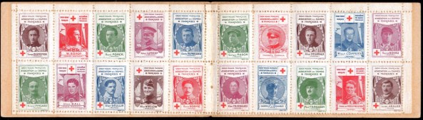 1916 – 108 : Emission du Comité du Raincy. Nos « As » . Série de 30 vignettes. RV. 17 x 24 ou 18 x 24. Dentelées 11 et ND. Tous les portraits en noir, cadre : 1) Violet 2) Bleu 3) Vert 4) Brun clair 5) Jaune-orange. Vendues en carnets comprenant la série complète de 20 vignettes en deux panneaux de 10.