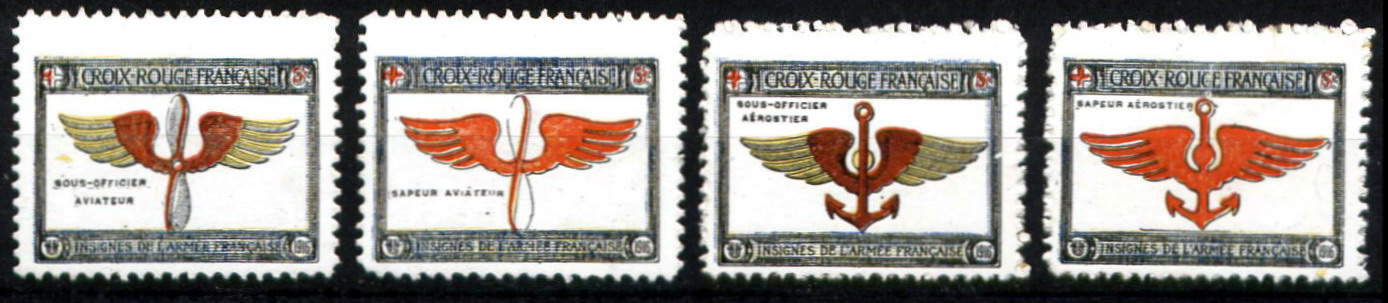 1916 – 106 : « Insignes de l’Armée Française » . Série de 20 vignettes. RV ou RH. 21 x 30 ou 30 x 21. Toutes avec valeur « 5 c. ». Dentelées 11 et ND. Seules, dans la série, sept vignettes se rapportent à l’aérostation ou l’aviation :
