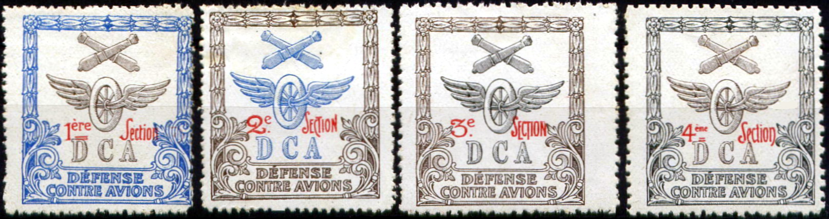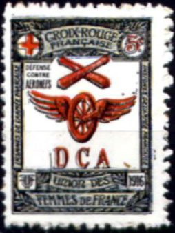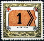 1916 – 107 : « L’Armée Française. Ecussons des Corps de Troupe » . Série de 30 vignettes. RH. 30 x 27. Toutes avec valeur « 5 c. ». Dentelées 11 et ND. Seules, deux vignettes ans la série concernent l’aérostation et l’aviation :