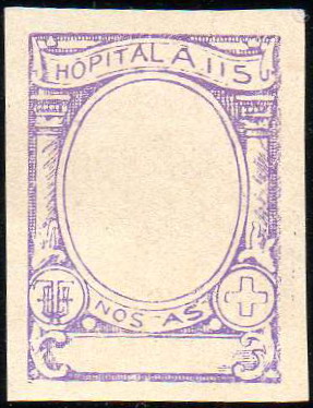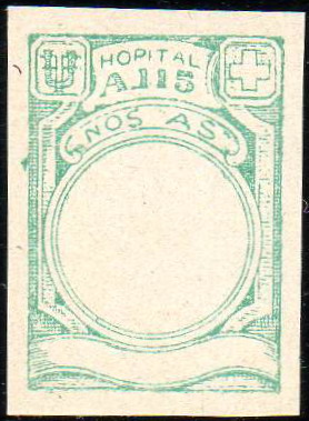 3° Au centre, entre deux colonnes, médaillon ovale V destiné à recevoir le portrait d’un aviateur. Au-dessus du médaillon « Hôpital A 115 ». Au-dessous, « Nos As » entre le monogramme U.F.F. et une croix. Cartouche blanc dans le bas.