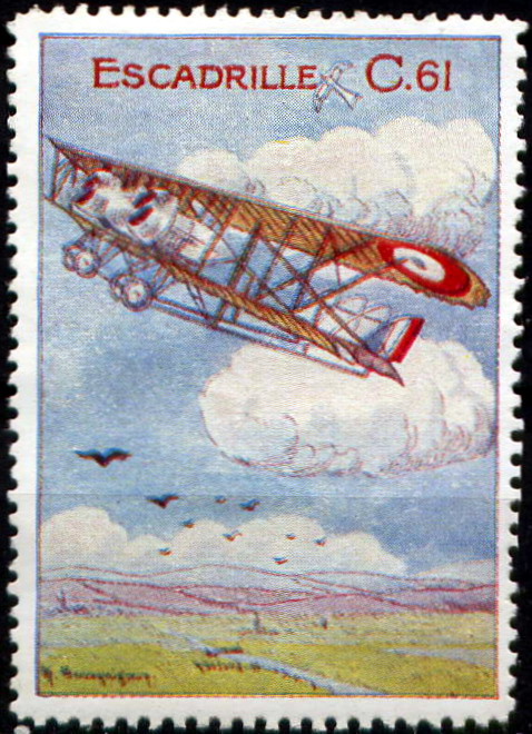 Escadrille C 61. RV. 35 x 50. Biplan montant vers la gauche. Impression floue. Dentelée et ND.