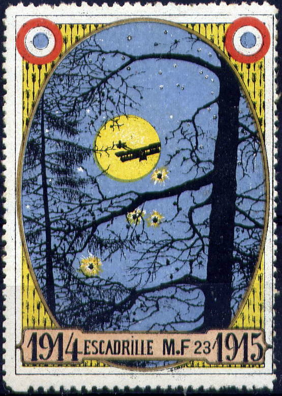 Escadrille MF 23. RV. 43 x 59. A travers des branches d’arbre, silhouette d’un biplan devant le disque de la lune. Cocardes tricolores aux deux angles du haut. Millésime 1914-1915. Dessin de G. Chanorier. Dentelée et ND.