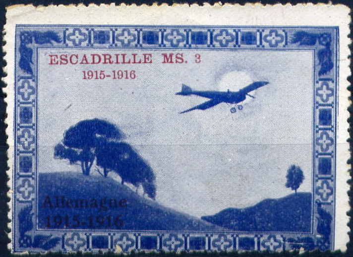 Escadrille n° 3. RV. 24 x 38. Au centre, biplan dans un cadre. Motifs allégoriques : arbre, fleurs, ailes, le tout stylisé. Dentelée.
