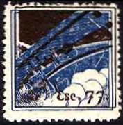 164 ter – 2° tirage. Dessin retouché. L’obus éclate au-dessus de la locomotive. Biplan vu de face. 25 x 36. Dentelée. Couleur : Polychrome.