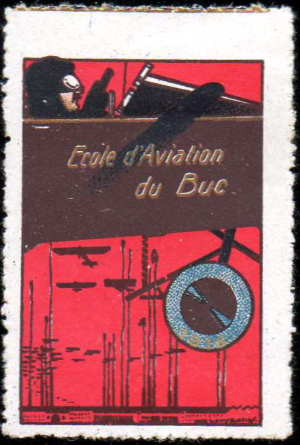 Ecole d’Aviation du Buc. RV. 29 x 44. Partie du fuselage d’un avion, avec un aviateur. Usine et avion au-dessous. Dentelée.