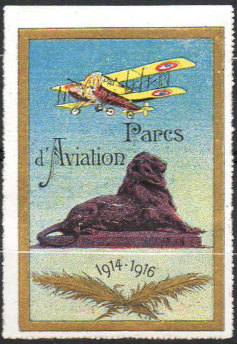 Parcs d’Aviation. RV. 35 x 52. Biplan survolant le lion de Belfort. Millésimes 1914-196. Dessin de Girardet. Dentelée et percée en points.