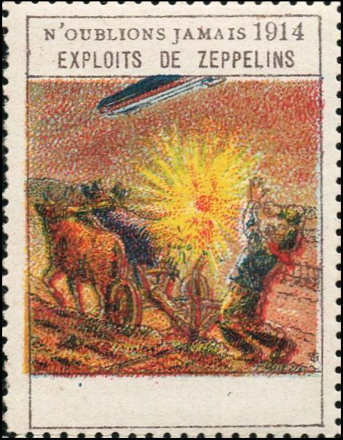 1914-1915 – Emission de l’imprimerie-papeterie A. Bordet et Cie – Lyon. « N’oublions jamais 1914 ». Série de 12 vignettes dont une seule se rapporte à l’aérostation. RV. 30 x 42. Bombe, lâchée par un zeppelin que l’on voit dans le ciel, éclatant au-dessus d’une charrue traînée par deux boeufs, le laboureur s’effrondrant. « Exploits de zeppelins ». Dentelée et ND.