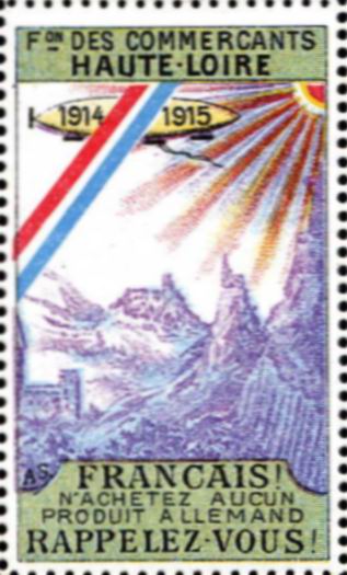 1914-1915 – Fédération des commerçants de la Haute-Loire. RV. 30 x 52. Texte en haut : « Français ! N’achetez aucun produit allemand ». En bas : « Rappelez-vous ! ». Bande tricolore en diagonale barrant le haut de la vignette à gauche. Dirigeable survolant des montagnes et des monuments du Puy. Soleil irradiant en haut à droite. Millésimes 1914-1915 sur le dirigeable. Dentelée.