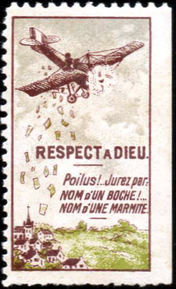 1916 – Respect à Dieu. Poilus ! Jurez par : Nom d’un boche !… Nom d’une marmite ! RV. 19,5 x 36. Avion survolant un village et lâchant des tracts. Dentelée.