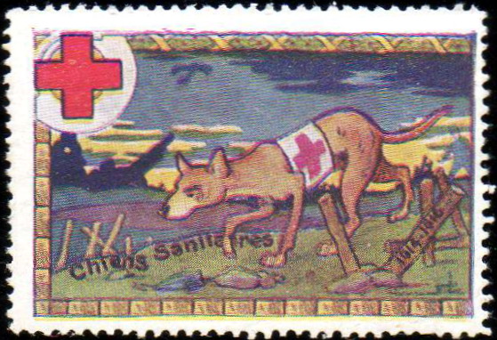 Chiens sanitaires. RH. 42 x 27. Chien sanitaire au bord d’une tranchée : scènes survolée par un avion. Croix rouge dans un cercle en haut à gauche. Millésimes 1914-1916 dans le coin inférieur droit. Dentelée.