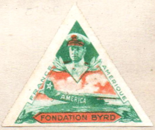 410 – Triangle isocèle. En haut, portrait de l’amiral Byrd. Au-dessous, hydravion America. A gauche, « France » ; à droite « Amérique » ; en bas « Fondation Byrd« . Base 36, côtés 34. Percée en points. Couleurs : Polychrome.