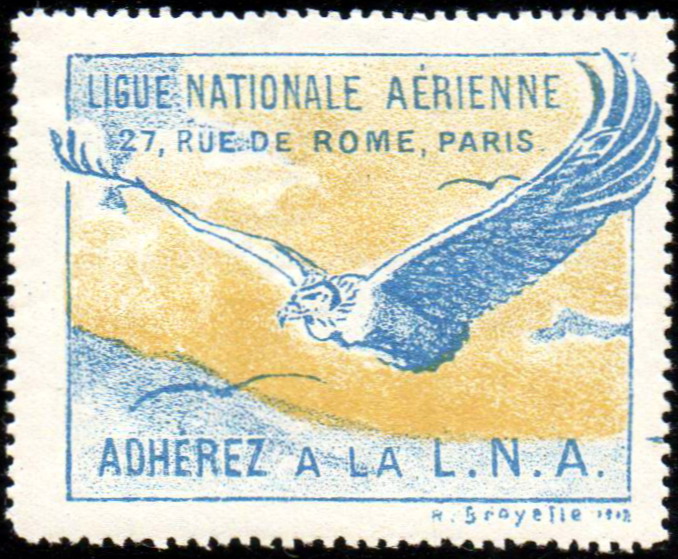 1912 – 349 – RH. En gros plan, un vautour-oricou en vol. Deux oiseaux. En haut sur deux lignes : « Ligue Nationale Aérienne / 27, rue de Rome – Paris« . En bas : « Adhérez à la L.N.A.« . Sous le cadre, à droite : « R. Broyelle – 1912 » (R. Broyelle = Raphaël Broyelle). Dessin de Louillard. Dentelée. 52 x 38. Couleurs : Bleu et jaune-orangé.
