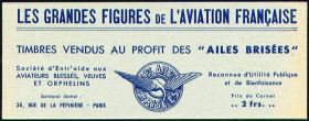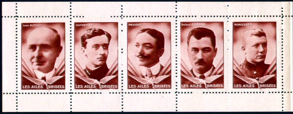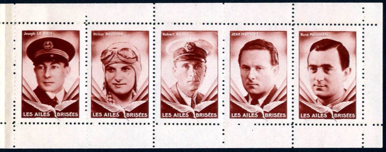 1937 (?) – 351 – Série de 10 vignettes RV représentant des aviateurs disparus. Effigie au-dessus de l’insigne de l’association (oiseau mort, les ailes étendues et la tête pendante : 1) Louis Blériot 2) Guynemer 3) Pégoud 4) Roland Garros 5) Nungesser 6) Joseph Le Brix 7) Hélène Boucher 8) Robert Bajac 9) Jean Mermoz 10) René Paulhan. Dentelée. 23 x 36. Couleurs : a) Violet b) Brun-rouge.