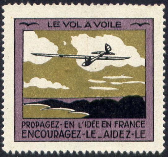 1932 – 354 – RH. Le vol à voile. Planeur au-dessus des nuages. En haut : « Le vol à voile » entre deux silhouettes d’oiseaux. En bas : « Propagez-en l’idée en France. Encouragez-le. Aidez-le« . Dentelée. 38 x 33. Couleurs :