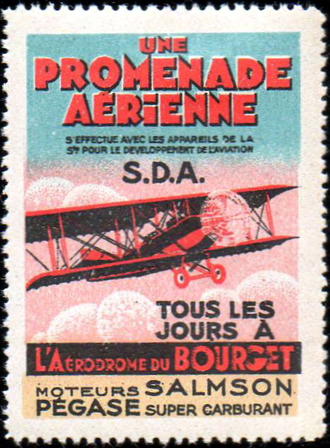 Vers 1925 – 355 – RV. Biplan au-dessus des nuages. En haut, en rouge sur 3 lignes : « Une promenade aérienne« , puis, en noir sur 3 lignes : « s’effectue avec les appareils de la Sté pour le développement de l’aviation S.D.A.« . Sous le biplan, en noir : « l’Aérodrome du Bourget« . En bas : « Moteurs Salmson, Pégase super-carburant » en noir sur fond jaune clair. Dentelée. 34 x 41. Couleurs : Polychrome.