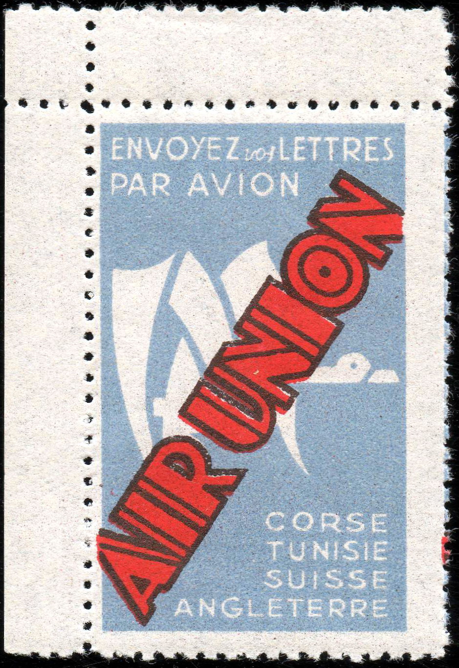 Vers 1928 – 356 – RV. Oiseau stylisé en vol. Devant, en diagonale prenant toute la hauteur et toute la largeur de la vignette : « Air-Union » en lettres rouges bordées de noir. En haut : « Envoyez vos lettres par avion« . En bas : « Corse, Tunisie, Suisse, Angleterre« . Dentelée. 26 x 44. Couleurs : Bleu, rouge et noir.