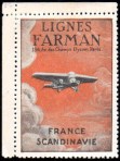 19.. – 357 – RV. Avion dans les nuages. En haut : « Lignes FARMAN – 136, Av. Champs-Elysées« . En bas : « France – Scandinavie« . Dentelée. 35 x 50. Emise en bloc-feuillet 54 x 69. Couleurs : Rouge, orange et noir.
