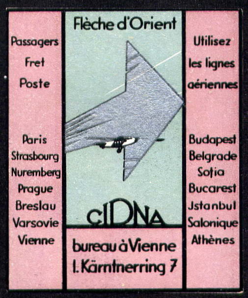 19.. – 358 – RV. Au centre, avion stylisé en forme de flèche se dirigeant vers la droite. Au-dessus : « Flèche d’Orient » ; au-dessous : « C. I. D. N. A.« . Texte dans les cadres de gauche, de droite et du bas. ND. 40 x 48. Couleurs : Lilas, bleu et argent.