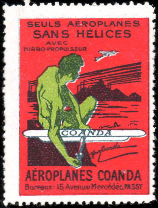 1 – Texte : « Seuls aéroplanes sans hélices avec turbo-propulseur. Aéroplanes Coanda – Bureaux 15, avenue Mercédès – Passy« . Couleur : Rouge.