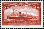 379 – RH. En haut, mappemonde ailée au-dessus de l’inscription « Aéro-Poste« . Chiffre « 5 » dans un cercle orné de chaque côté. Vue du paquebot Ile-de-France. En-dessous « S. S. Ile-de-France« . Imprimé par l’Institut de Gravure. Dentelée et ND. 35 x 21.
