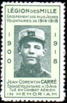 381 – RV. Au centre, dans un rectangle, portrait de Jean-Corentin Carré, engagé volontaire à 15 ans, tué en combat aérien. « In memoriam« . Millésimes 1900-1918 encadrant le portrait. Dentelée 22 x 37. Couleurs : Vert foncé sur vert clair.