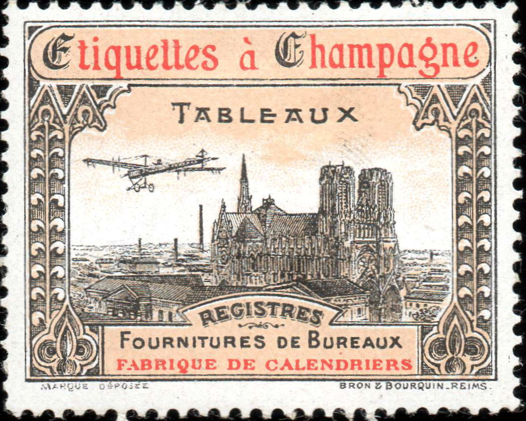385 – RH. Même vignette que ci-dessus avec inscriptions modifiées. En haut « Etiquettes à champagne » ; en bas « Registres – Fournitures de bureaux – Fabrique de calendriers« . Au-dessus de la cathédrale et du monoplan « Tableaux« . Sous le cadre, en bas, « Marque déposée. Bron et Bourquin« . Dentelée. 40 x 30. Couleurs : Brun, orange et rouge.