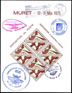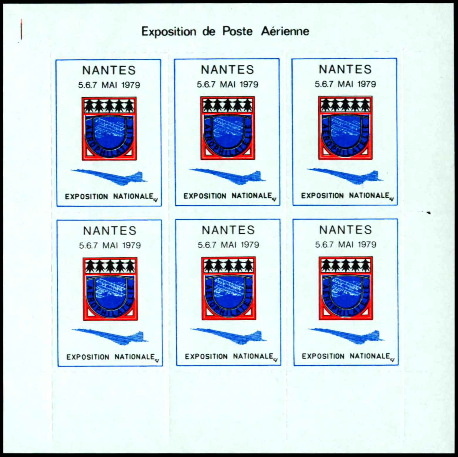 Ces vignettes étaient imprimées par feuillet de 6 ex. Sur la marge supérieure du feuillet : « Exposition de Poste Aérienne« . Deux variantes de ce feuillet vertical :
