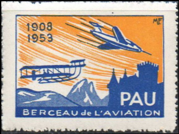 602 – Biplan des Frères Wright et avion à réaction survolant les montagnes et le château de Pau. En haut, à gauche : « 1908-1953« . Seule inscription en bas : « PAU / Berceau de l’aviation« . RH. Dentelée et ND. Couleurs : Bleu et orange.