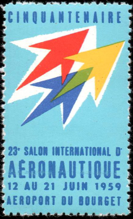 627 – Trois flèches symbolisant des avions. En haut : « Cinquantenaire« . En bas, sur 4 lignes, annonce du Salon, date et lieu. RV. Dentelée. Couleurs : Bleu foncé, bleu ciel, rouge et jaune.