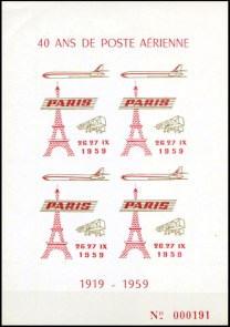 628 – Tour Eiffel à gauche et banderolle « PARIS ». En haut, silhouette d’avion moderne. A droite, biplan de 1919. Vignette présentée en bloc-feuillet de 4 vignettes dentelées. Le texte et les dates ci-dessus ne figurent pas sur la vignette mais sur les marges supérieure et inférieure du feuillet. RV. Dentelée. Couleurs : Bleu et doré sur blanc.