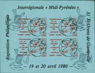 629 – Bloc-feuillet avec ce texte (mentionné dans le titre ci-dessus) sur 4 lignes et sous le dessin qui est la reprise de la vignette de 1934 : avions survolant une vallée. RV. ND. Couleurs : a) Bleu foncé sur bleu ciel b) Bleu foncé sur blanc c) Bleu foncé sur rose.