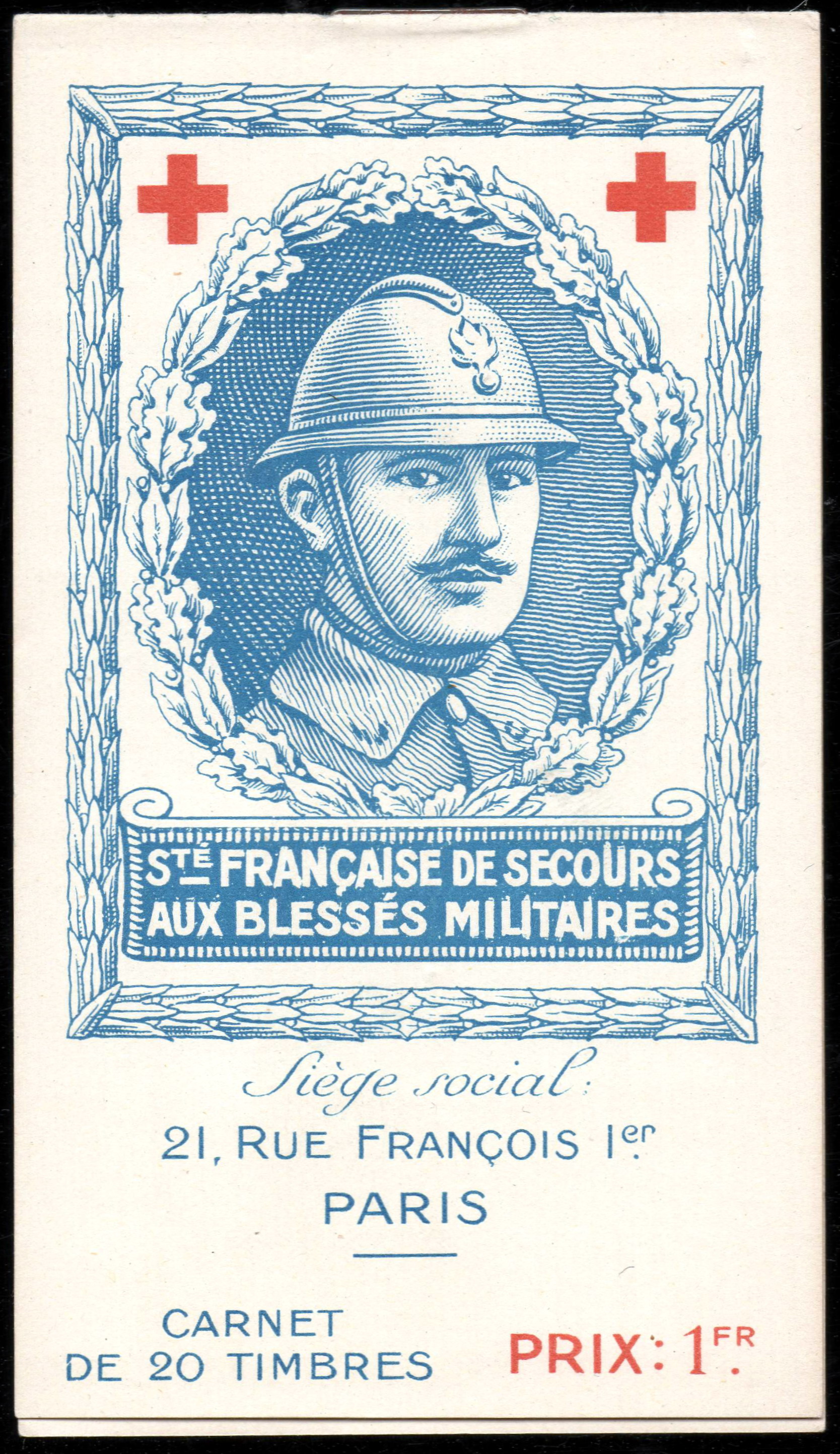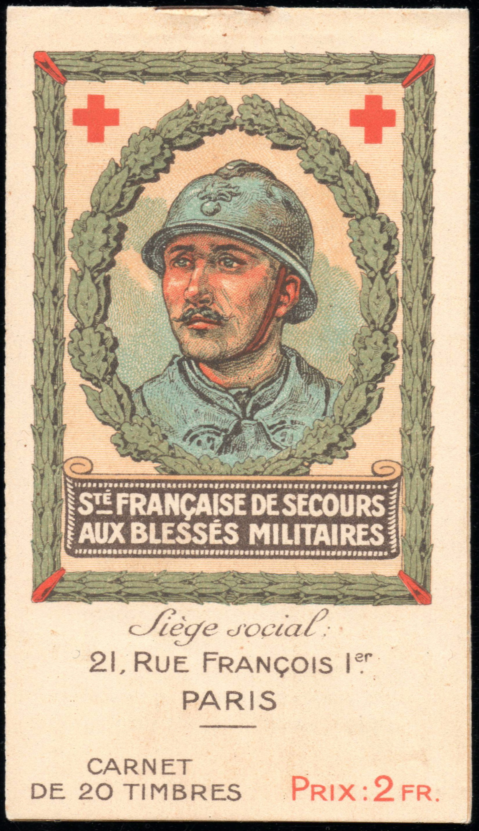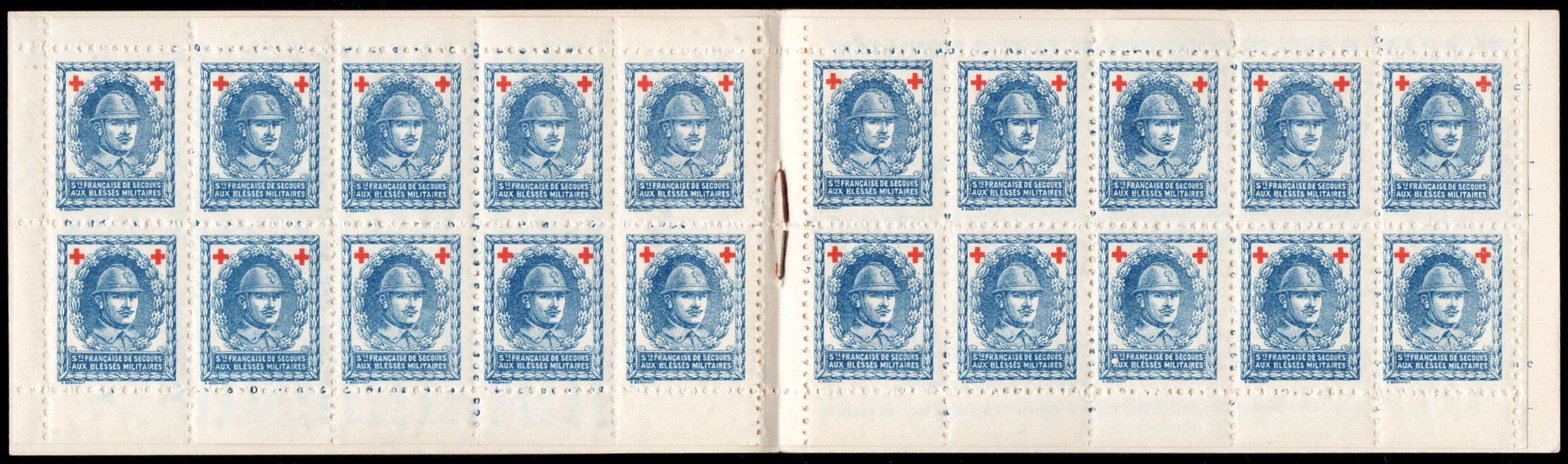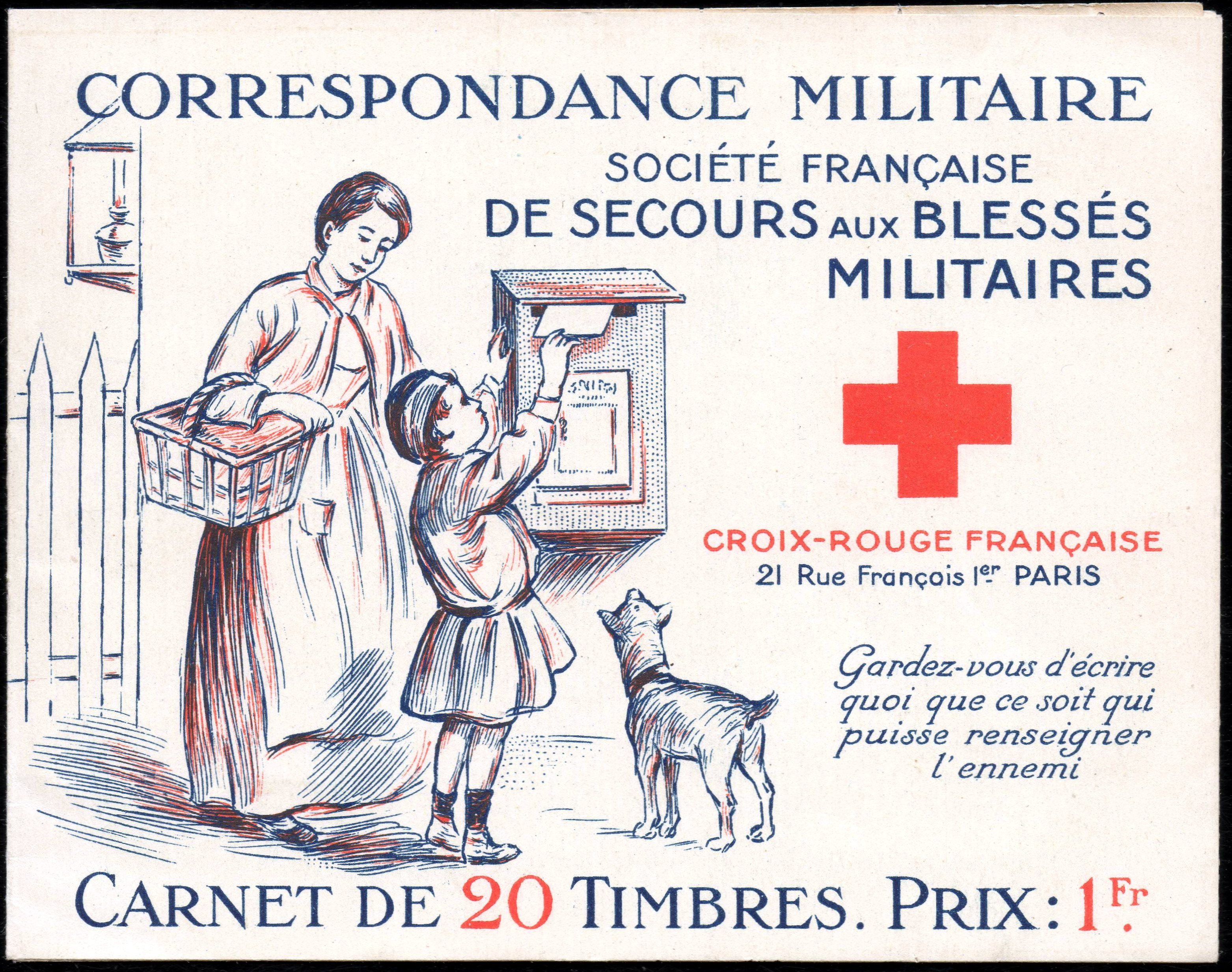 1/1 – Carnet de 20 timbres (2 planches de 10 – 5 x 2) sous couverture bulle. RV 100 x 135 avec texte en rouge : « Croix-Rouge française – Société de Secours aux Blessés Militaires – 19, rue Matignon – Paris« . Croix rouge au centre. A gauche : « Inter Arma Caritas« . A droite : « Songez aux soldats blessés ou malades« . En-dessous : « Carnet de 20 timbres à 0,05. Prix UN franc« .
