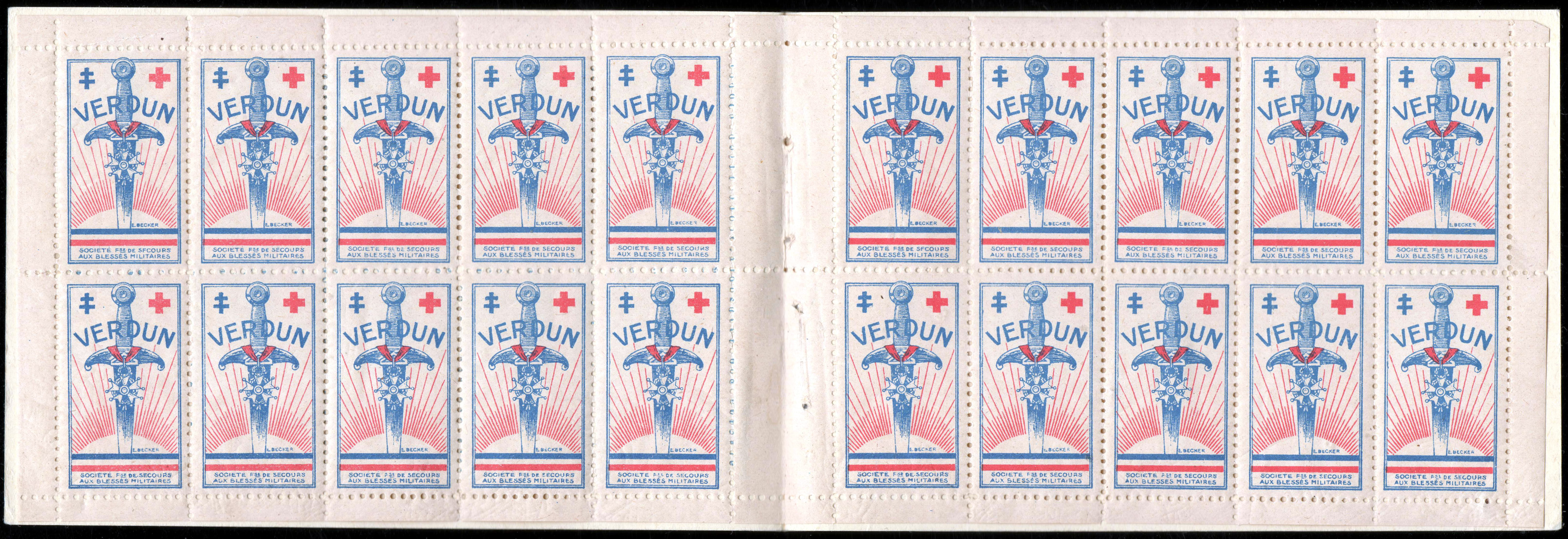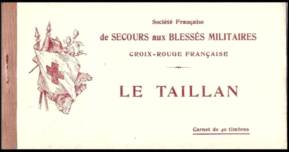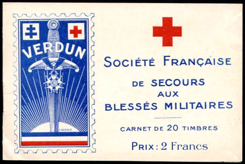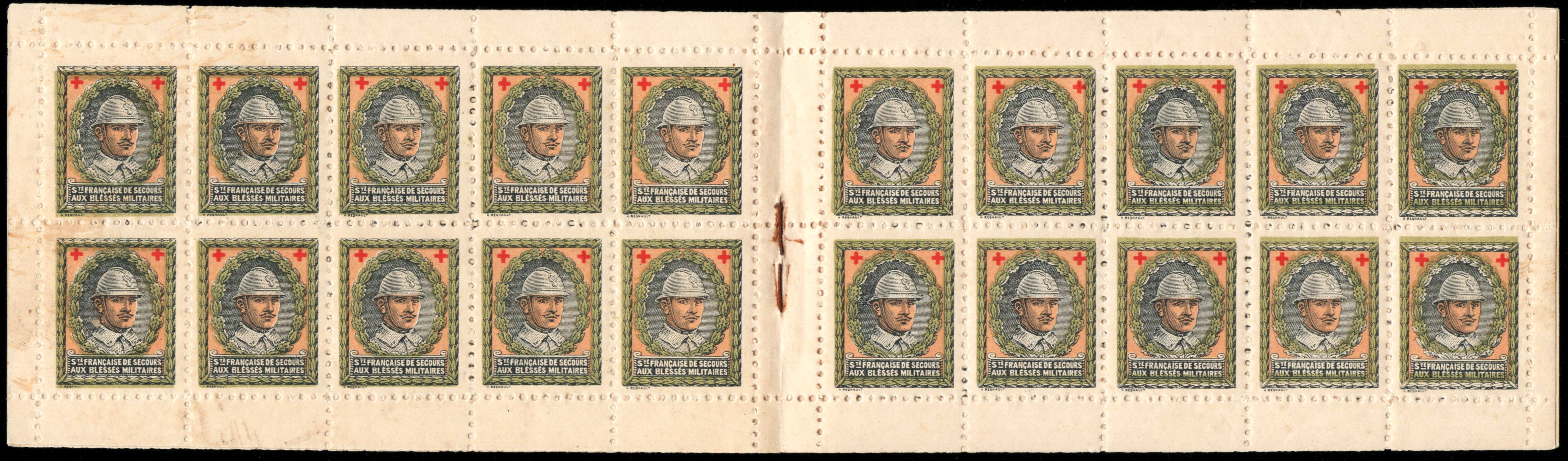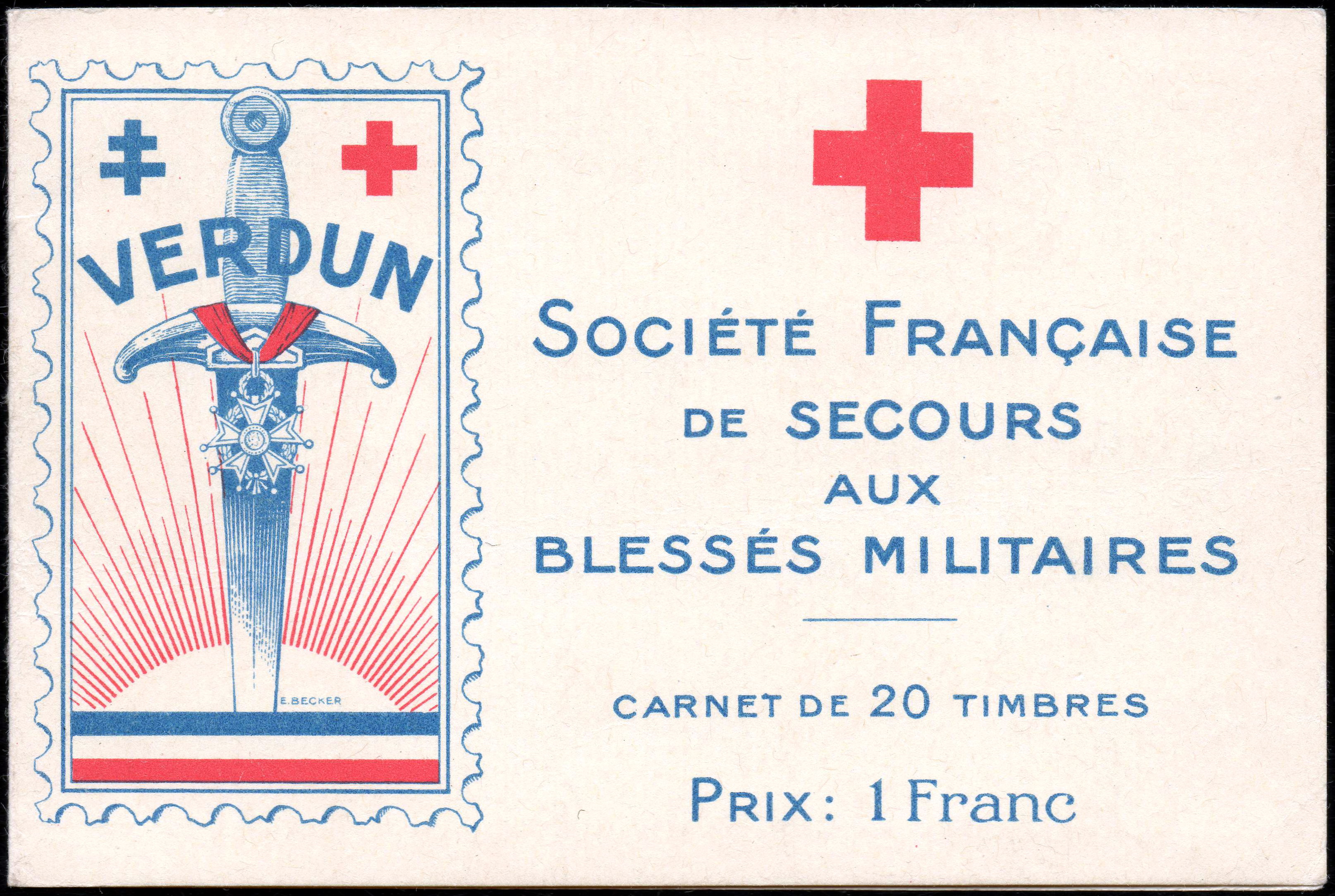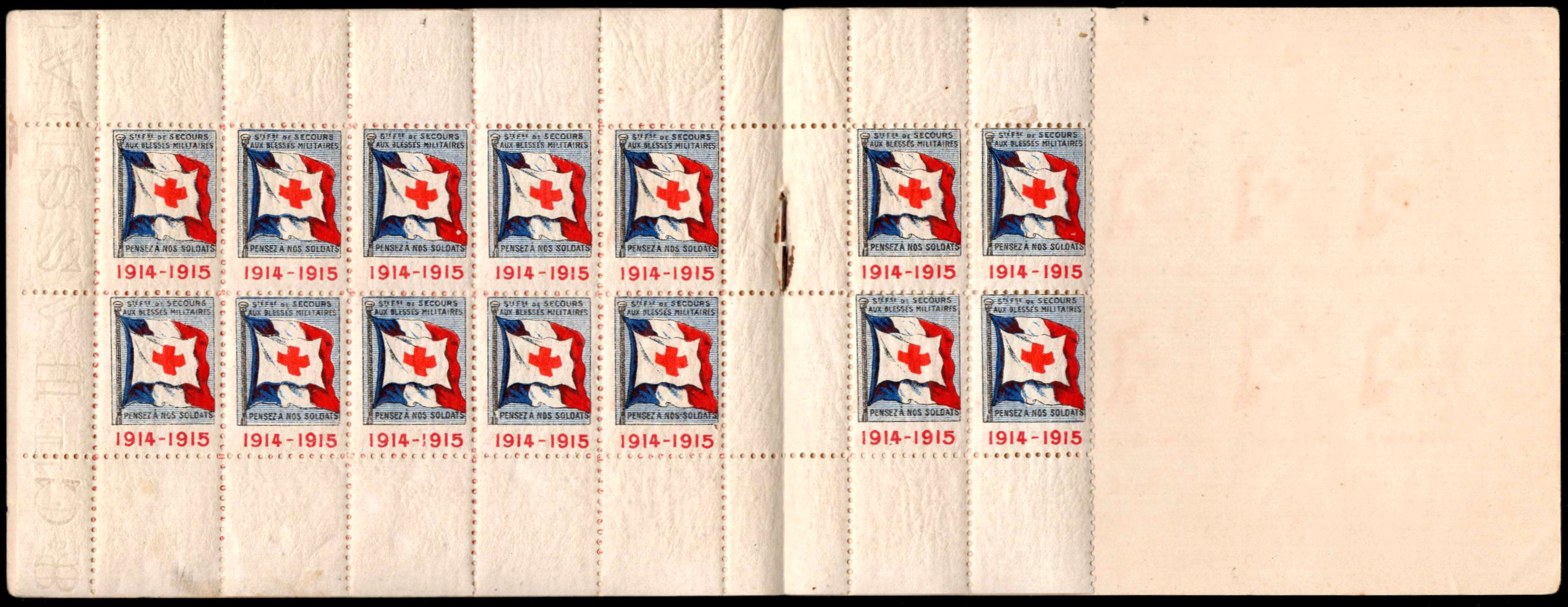 1/1 – Carnet de 20 timbres (2 planches de 10 – 5 x 2) sous couverture bulle. RV 100 x 135 avec texte en rouge : « Croix-Rouge française – Société de Secours aux Blessés Militaires – 19, rue Matignon – Paris« . Croix rouge au centre. A gauche : « Inter Arma Caritas« . A droite : « Songez aux soldats blessés ou malades« . En-dessous : « Carnet de 20 timbres à 0,05. Prix UN franc« .