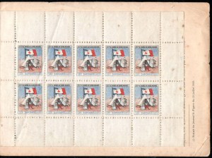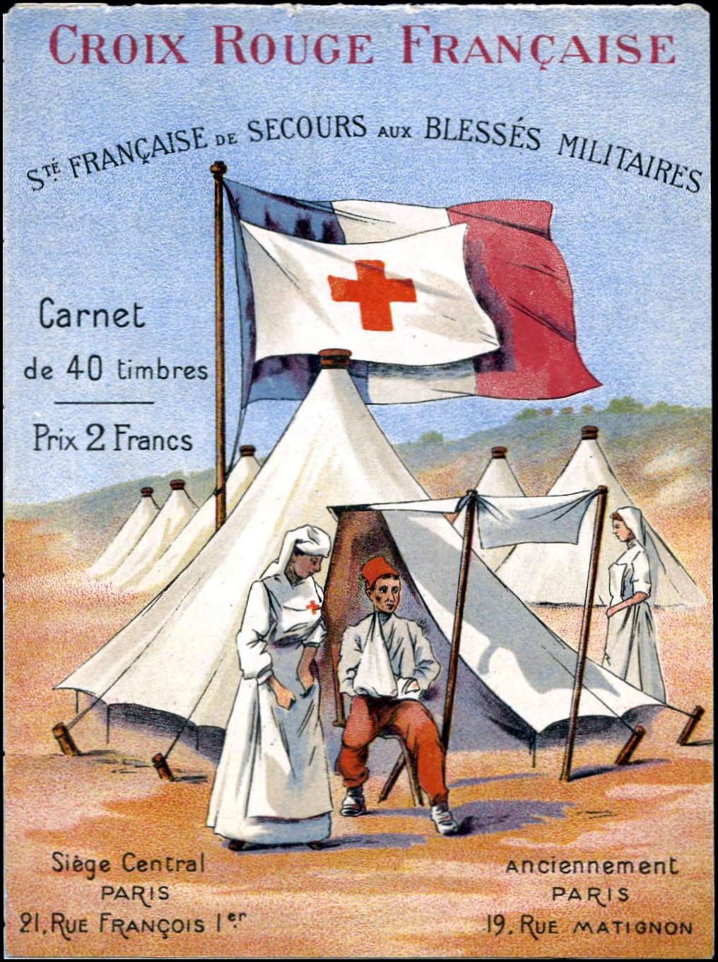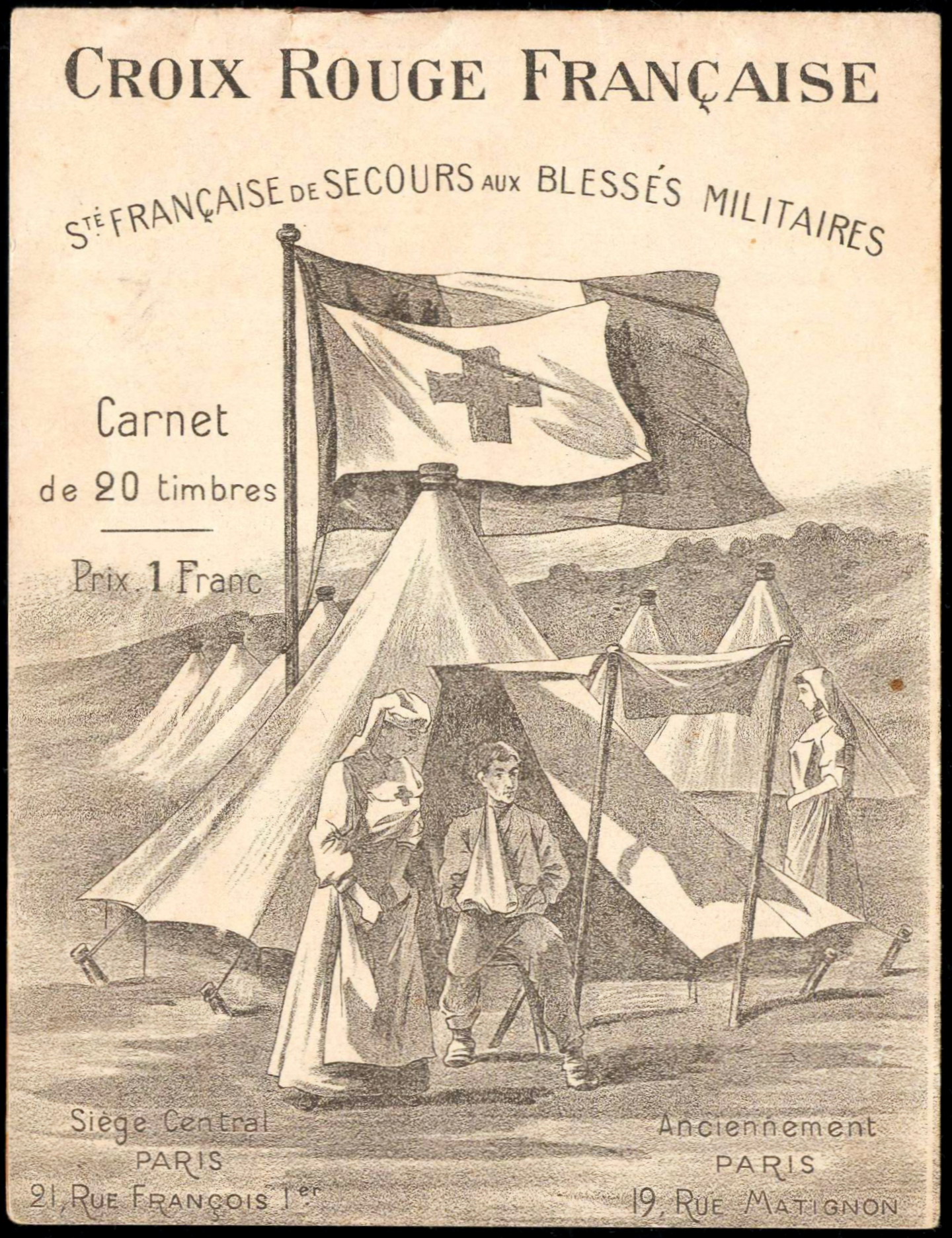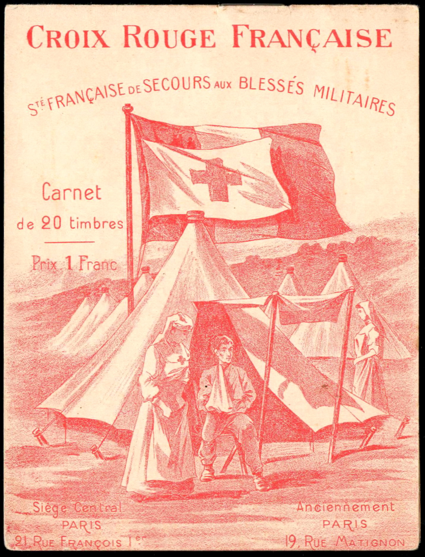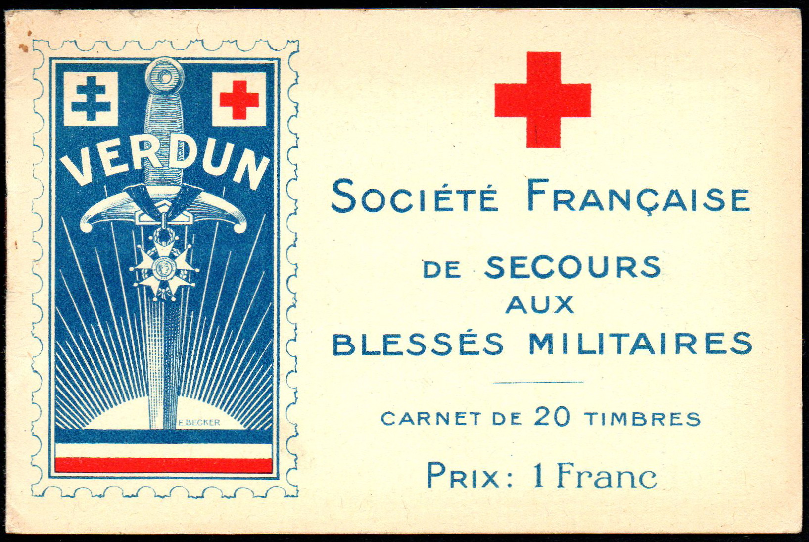1/1 – Carnet de 20 timbres (2 planches de 10 – 5 x 2) sous couverture bulle. RV 100 x 135 avec texte en rouge : « Croix-Rouge française – Société de Secours aux Blessés Militaires – 19, rue Matignon – Paris« . Croix rouge au centre. A gauche : « Inter Arma Caritas« . A droite : « Songez aux soldats blessés ou malades« . En-dessous : « Carnet de 20 timbres à 0,05. Prix UN franc« .
