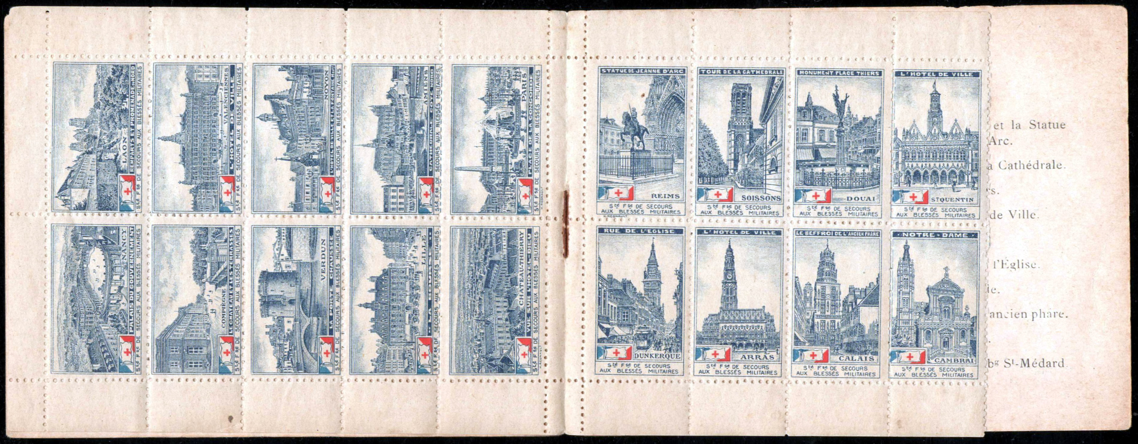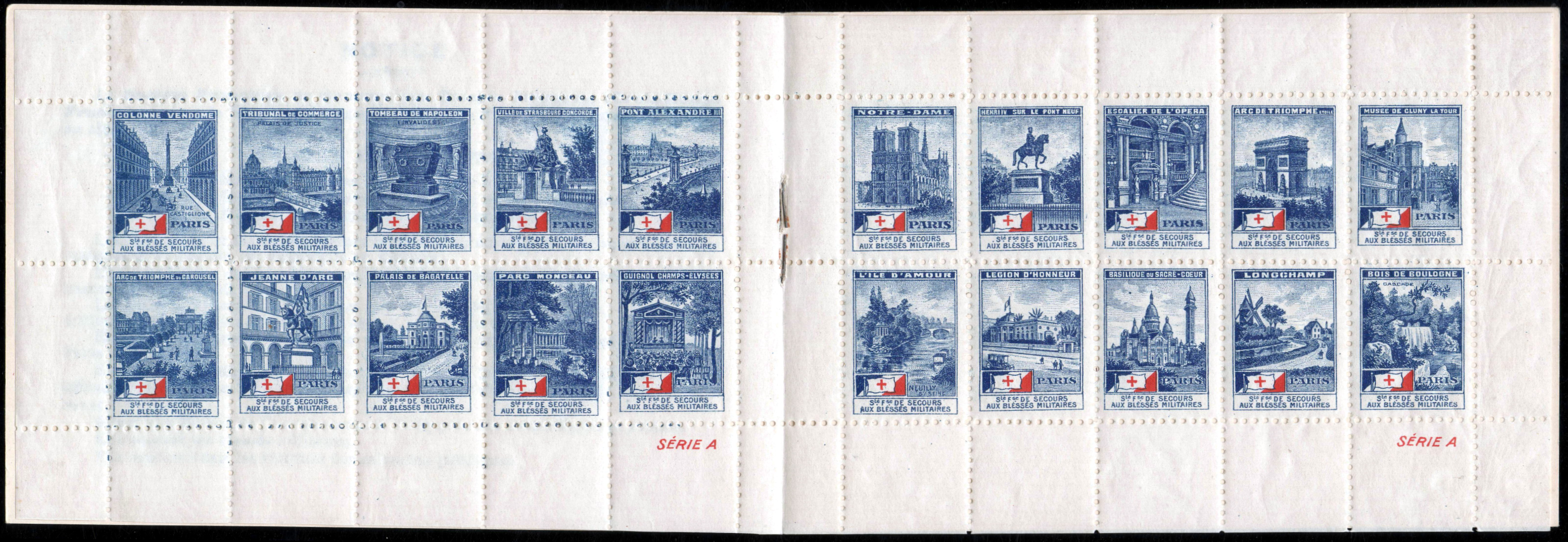 20 timbres RV 18 x 24. Vues diverses de Paris. Dans le bas, dans un cartouche blanc : Sté Fse de Secours aux Blessés Militaires ». Au-dessus, à gauche, emblème de la S.S.B.M. En haut, désignation du monument ou du site représenté.