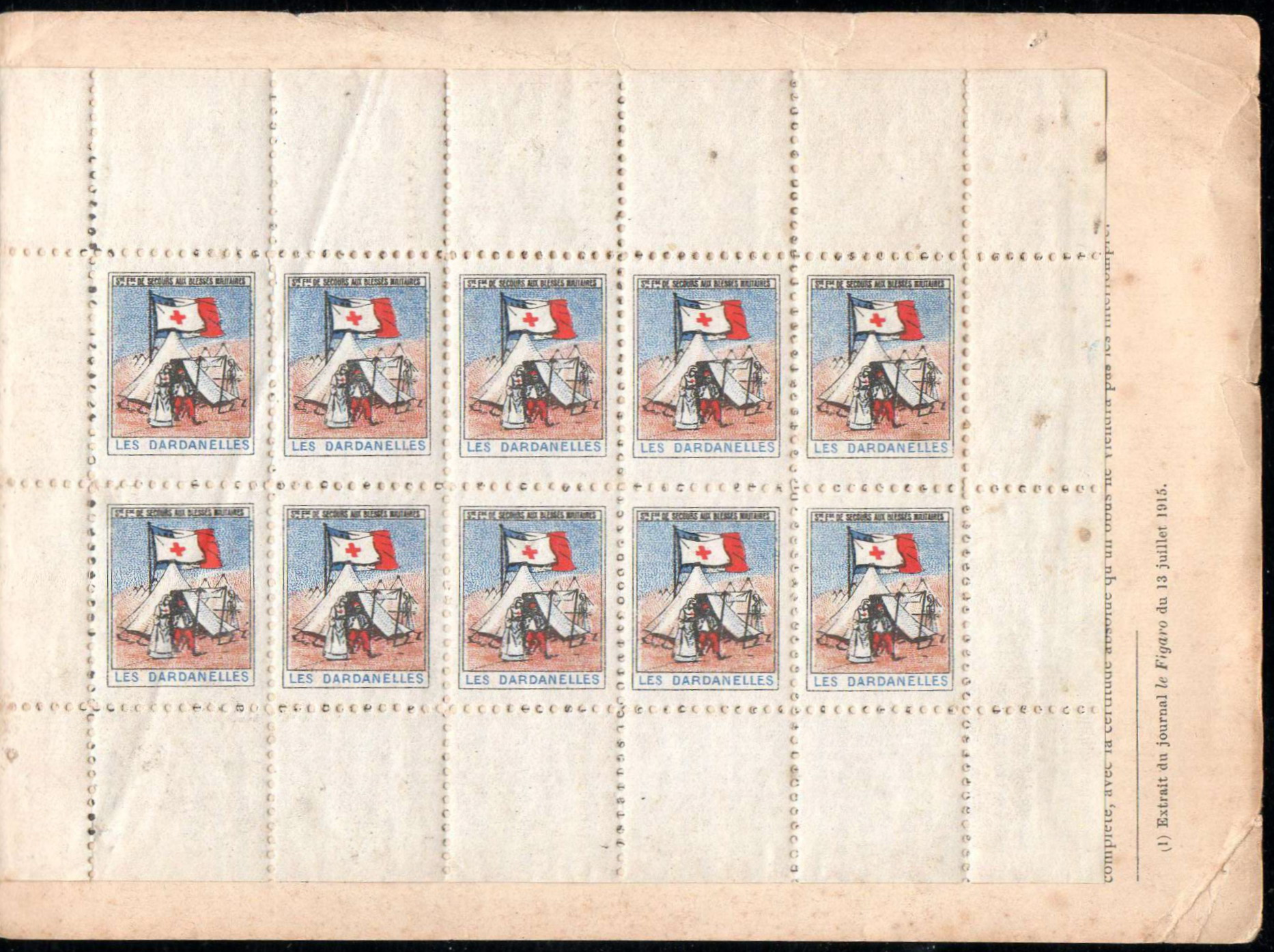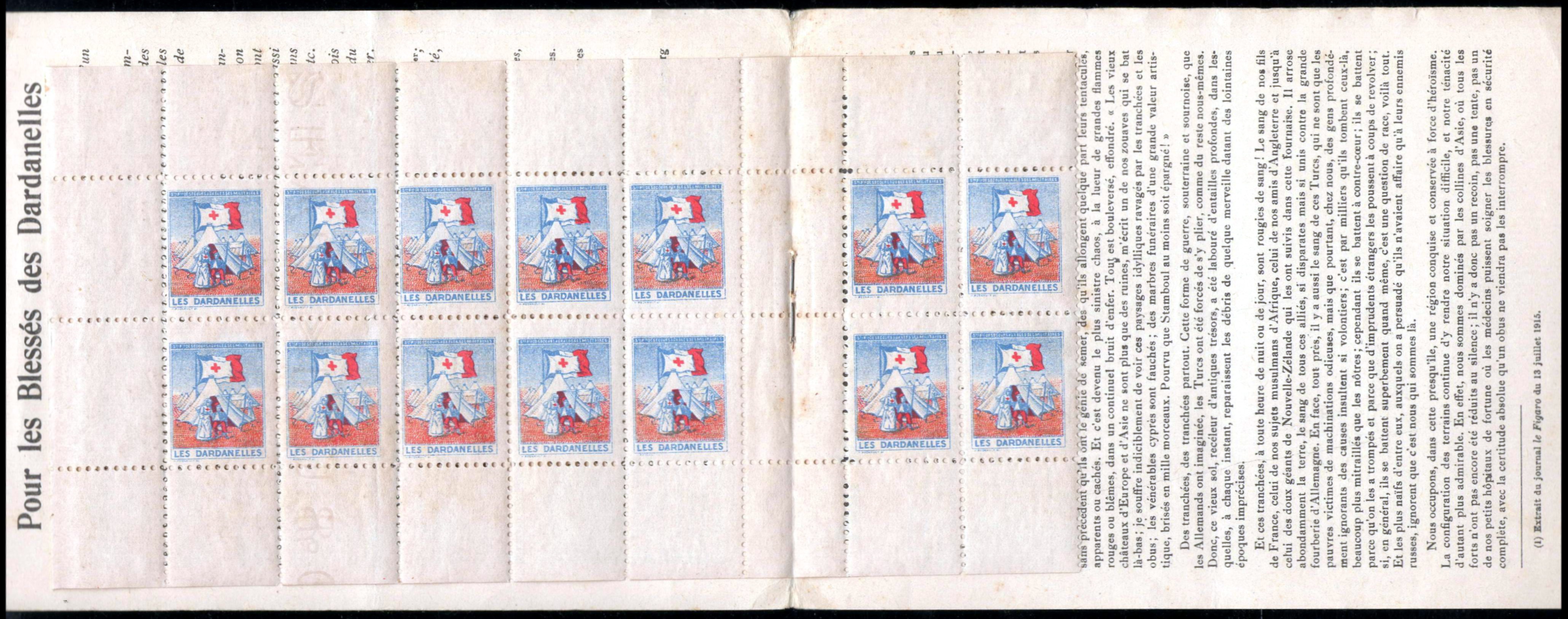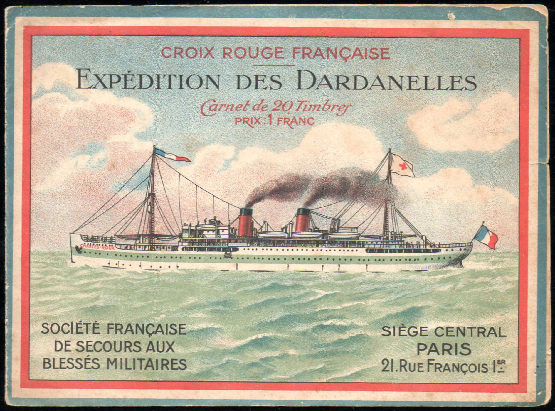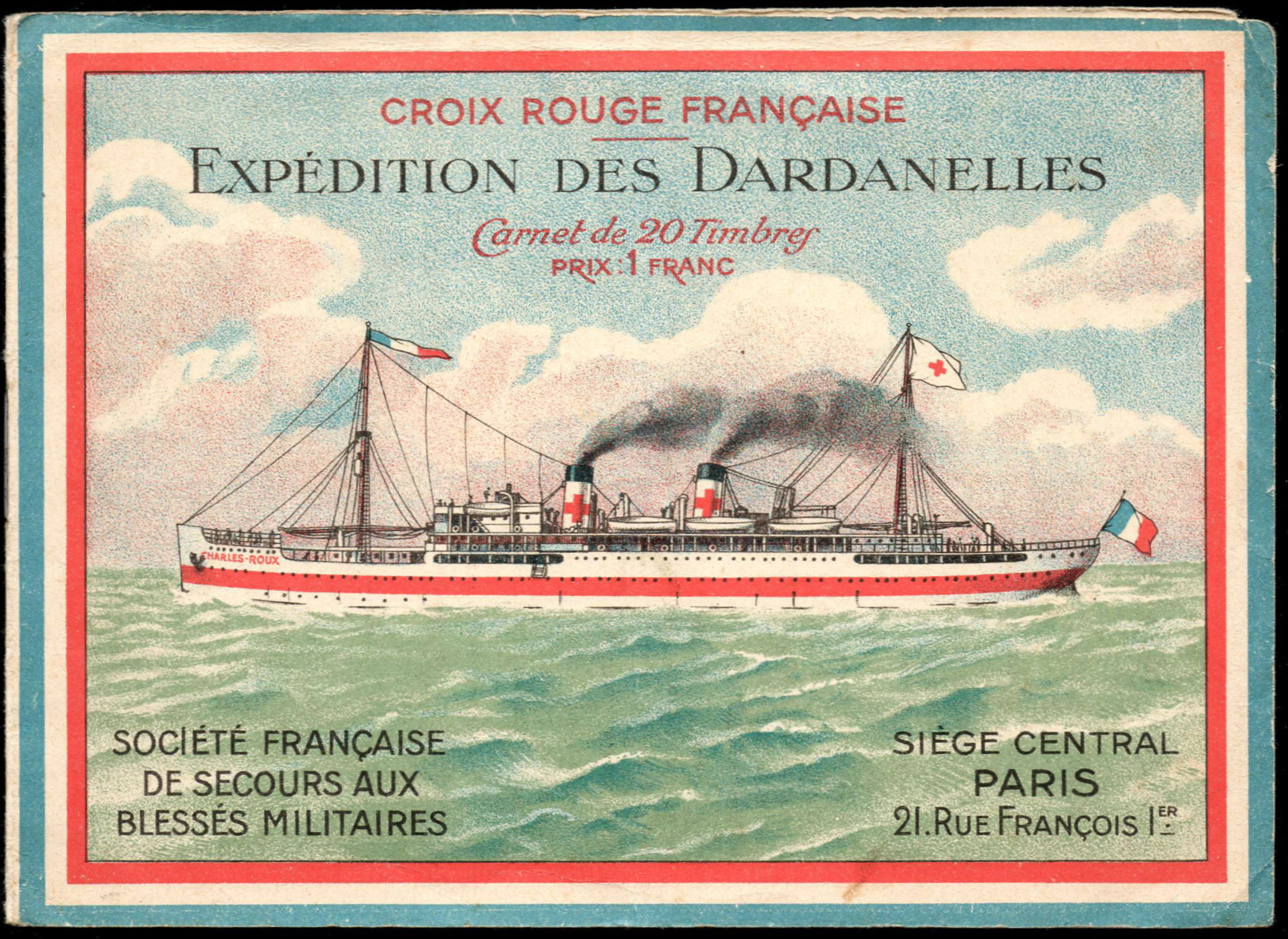 21/1 – Carnet de 20 timbres (2 planches de 10 – 2 x 5), sous couverture RH 157 x 115, polychrome, représentant le navire-hôpital « Charles-Roux« . Le navire est peint en blanc avec une large bande verte. Les cheminées sont rouges. Texte en haut : « Croix Rouge française » (en rouge) ; » Expédition des Dardanelles » (en noir). « Carnet de 20 timbres. Prix 1 franc » (en rouge). En bas à gauche : « Société française de Secours aux Blessés militaires » ; à droite « Siège central Paris, 21 rue François-Ier » (en noir). Cadre tricolore tout autour. A l’intérieur de la couverture, à gauche, texte en noir intitulé « Pour les blessés des Dardanelles« , appel pour la réalisation du navire-hôpital. A droite et au verso, reproduction d’un article de Pierre Loti : « Pour les grands blessés d’Orient » et extrait du « Figaro » du 13 juillet 1915.