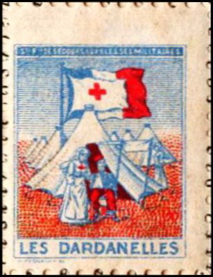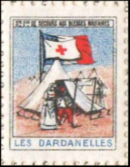 En haut, texte en noir sur blanc : « Sté Fse de Secours aux Blessés militaires ». En bas, texte en bleu sur blanc : « Les Dardanelles ». Dentelé. Bleu, rouge, brun-orange et noir ; le ciel est formé de pointillés bleus et le cadre, ainsi que les principaux contours du dessin, sont en noir.