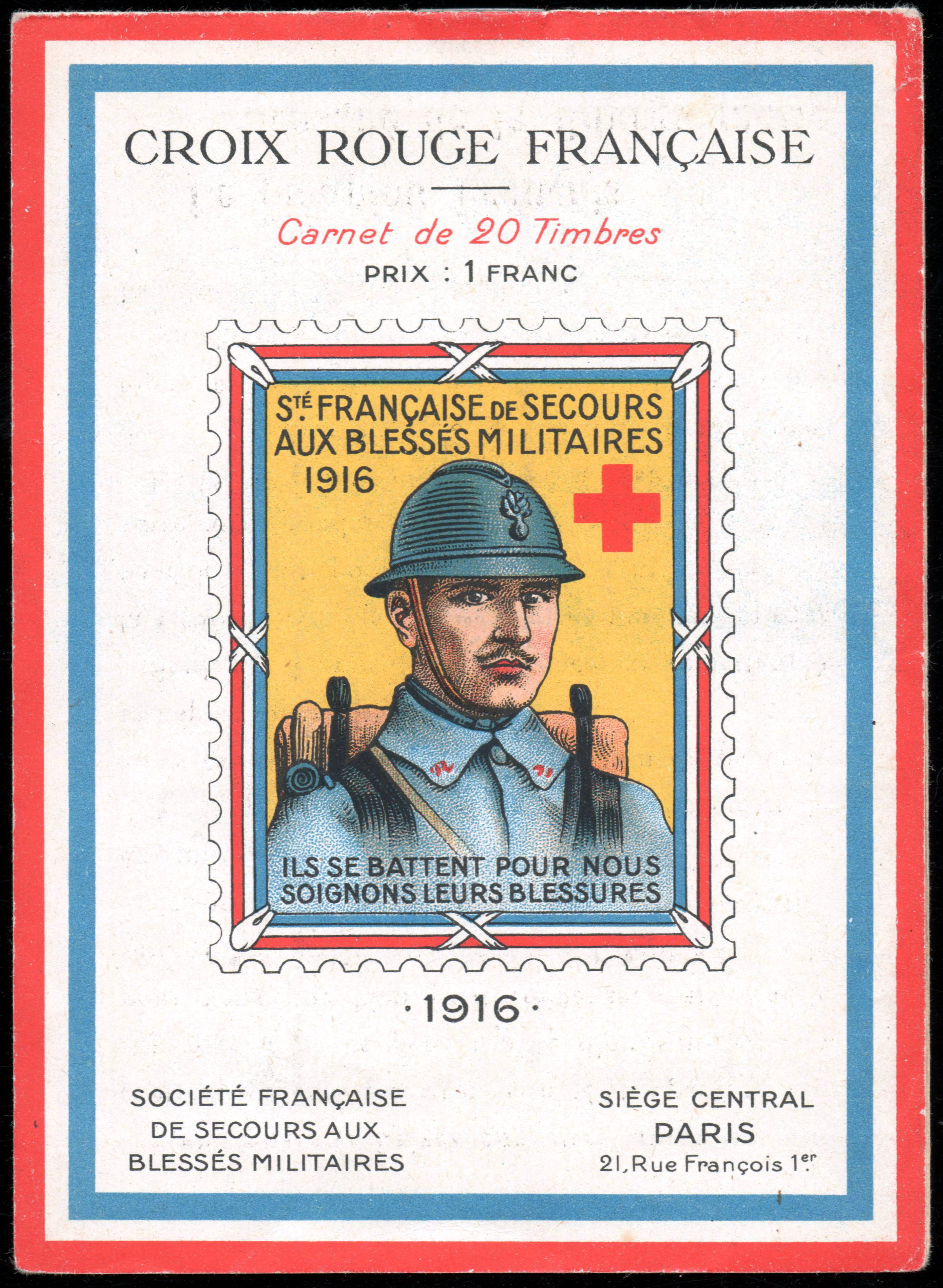 23 – 1916. Un timbre RV 18 x 22.Buste de fantassin tourné vers la droite, en bleu horizon, avec le casque. Cadre tricolore. En haut, en noir : « Sté française de Secours aux Blessés militaires, 1916 ». Croix rouge au-dessus à droite. En bas : « Ils se battent pour nous, soignons leurs blessures ». Dentelé. Bleu, rouge, orange, noir et jaune, texte en noir.